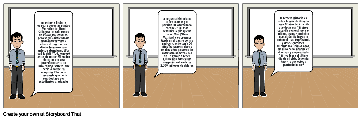 la segunda historia es sobre el amor y la perdida Fui afortunado porque en mi vida descubrí lo que quería hacer. Woz [Steve Wozniak] y yo creamos Apple en el garaje de mis padres cuando tenía 20 años.Trabajamos duro y en diez años pasamos de estar solo nosotros dos en un garaje a tener 4.000empleados y una compañía valorada en 2.000 millones de dólares