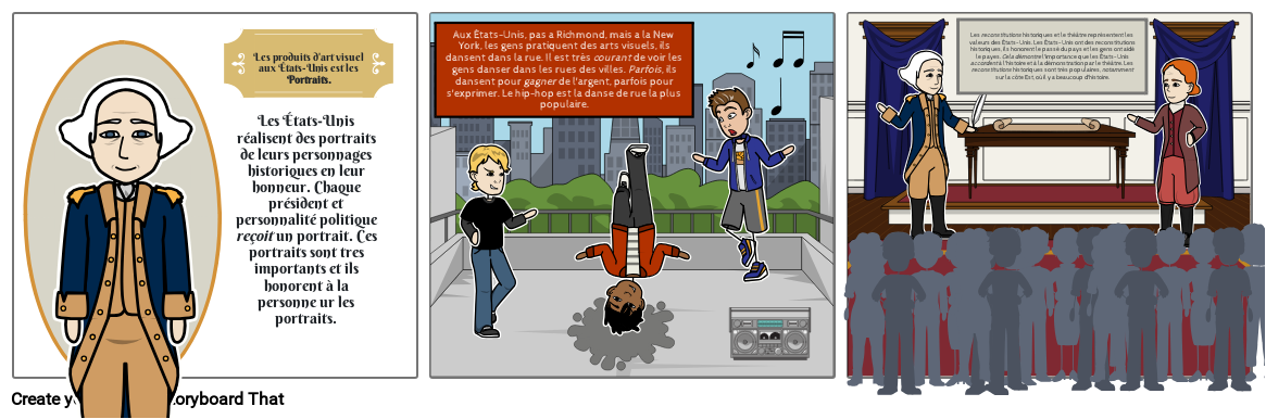 Les reconstitutions historiques et le théâtre représentent les valeurs des États-Unis. Les États-Unis ont des reconstitutions historiques, ils honorent le passé du pays et les gens ont aidé le payes. Cela démontre l'importance que les États-Unis accordent à l'histoire et à la démonstration par le théâtre. Les reconstitutions historiques sont très populaires, notamment sur la côte Est, où il y a beaucoup d'histoire.