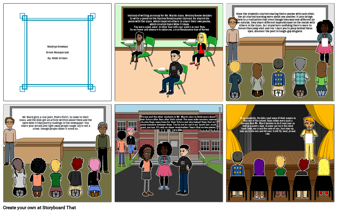 At an assembly, the kids read some of their poems to the rest of the school. Open mikes were such a success that Mr. Ward decides to do it next year as well as a poetry slam. A poem can turn the clock back, help you crack the code of you. Just step up, step up to the mic and let your truth fly, loud, proud, raw.
