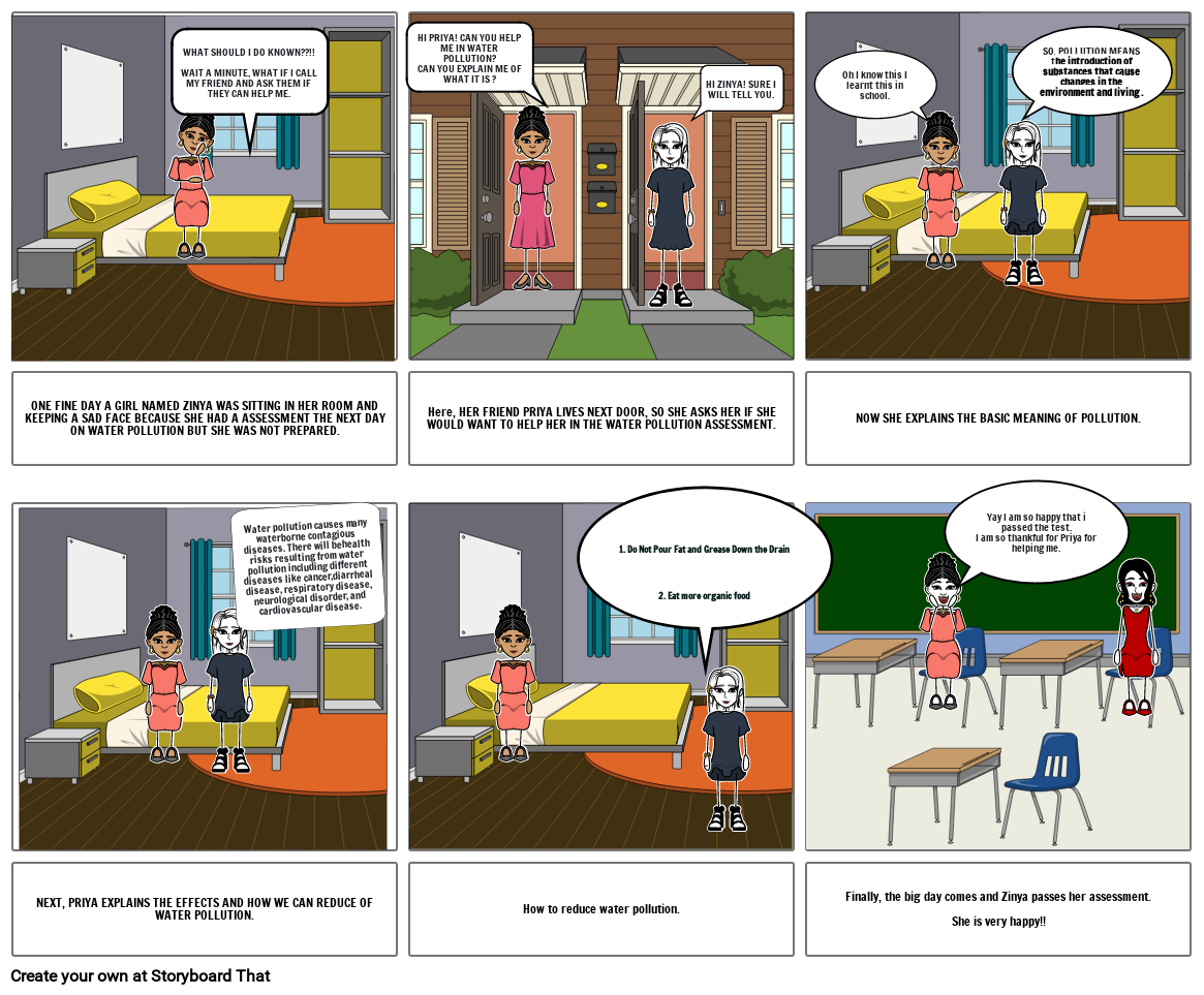 ONE FINE DAY A GIRL NAMED ZINYA WAS SITTING IN HER ROOM AND KEEPING A SAD FACE BECAUSE SHE HAD A ASSESSMENT THE NEXT DAY ON WATER POLLUTION BUT SHE WAS NOT PREPARED.