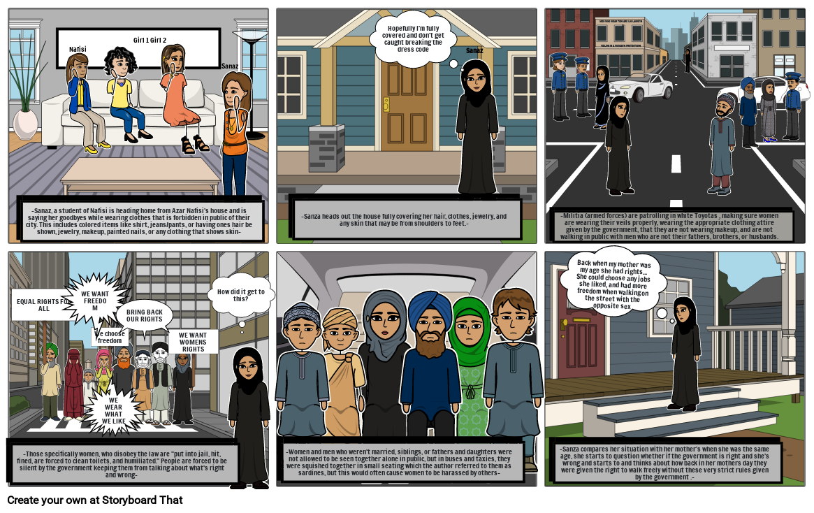 -Sanaz, a student of Nafisi is heading home from Azar Nafisi's house and is saying her goodbyes while wearing clothes that is forbidden in public of their city. This includes colored items like shirt, jeans/pants, or having ones hair be shown, jewelry, makeup, painted nails, or any clothing that shows skin-