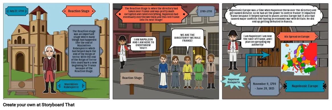 The Reaction Stage is when the directory had taken over France and was pretty much corrupted and ruled everything. Napoleon had eventually overthrown them and this led France into its next Stage!
