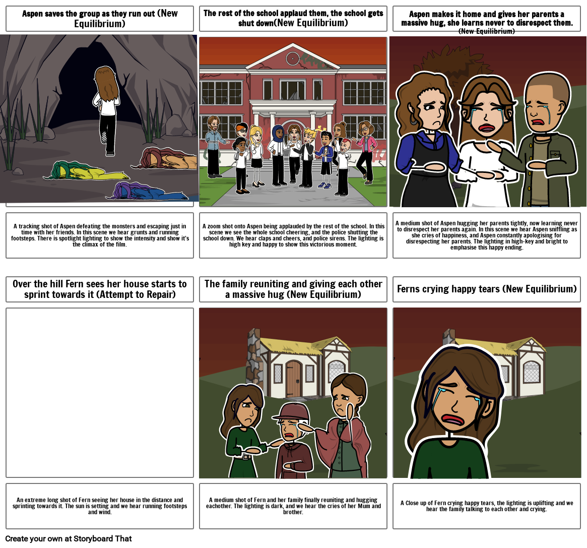 A zoom shot onto Aspen being applauded by the rest of the school. In this scene we see the whole school cheering, and the police shutting the school down. We hear claps and cheers, and police sirens. The lighting is high key and happy to show this victorious moment.