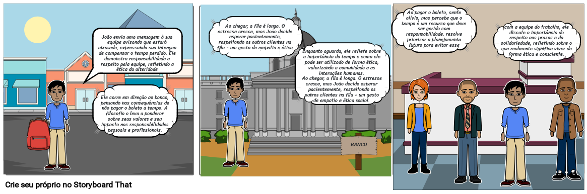 Enquanto aguarda, ele reflete sobre a importância do tempo e como ele pode ser utilizado de forma ética, valorizando a comunidade e as interações humanas.Ao chegar, a fila é longa. O estresse cresce, mas João decide esperar pacientemente, respeitando os outros clientes na fila - um gesto de empatia e ética social.