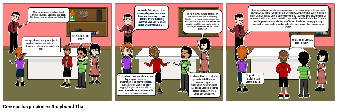 Chicos muy bien, todo lo que mencionaron es diversidad cultural, todas las ciudades tienen su cultura, tradiciones, arqueología, gastronomía y muchas más cosas, ahora que conocen más sobre la diversidad cultural, ustedes realizaran una exposición acerca de una ciudad del Perú puede ser la que ustedes quieran, y tú Victor, hablaras con tus papas y expondrás acerca de la cultura de ellos. nos vemos la próxima clase chicos.