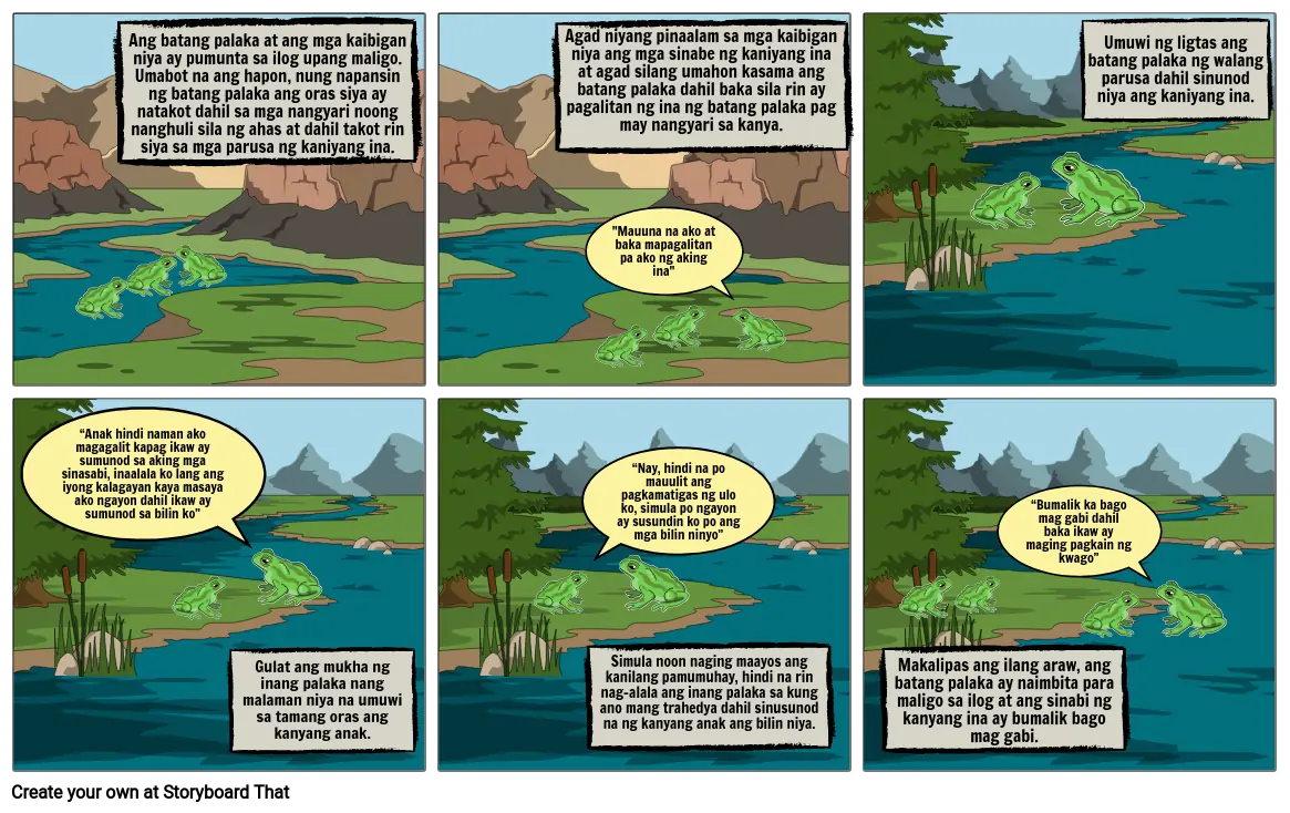 Agad niyang pinaalam sa mga kaibigan niya ang mga sinabe ng kaniyang ina at agad silang umahon kasama ang batang palaka dahil baka sila rin ay pagalitan ng ina ng batang palaka pag may nangyari sa kanya.
