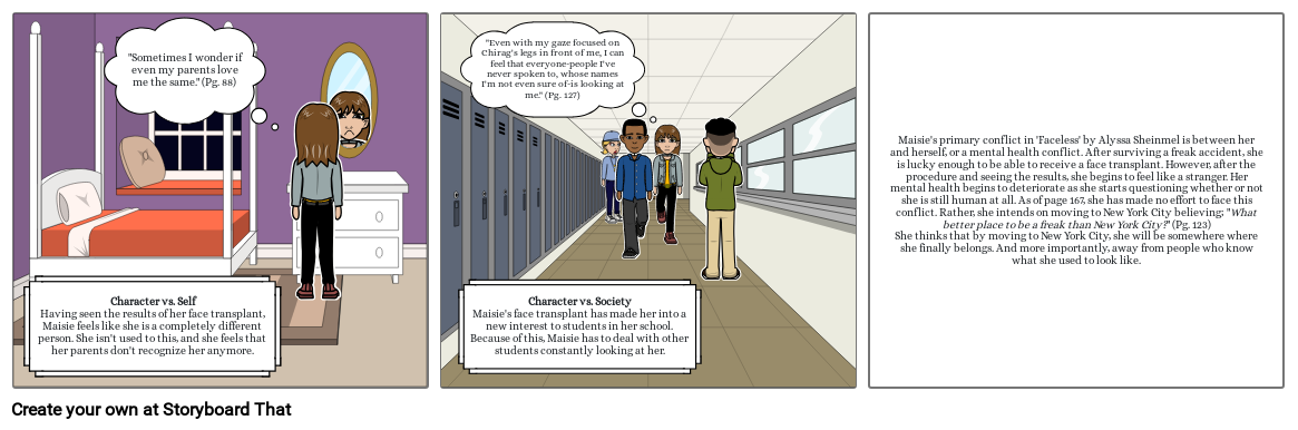 Character vs. SocietyMaisie's face transplant has made her into a new interest to students in her school. Because of this, Maisie has to deal with other students constantly looking at her.