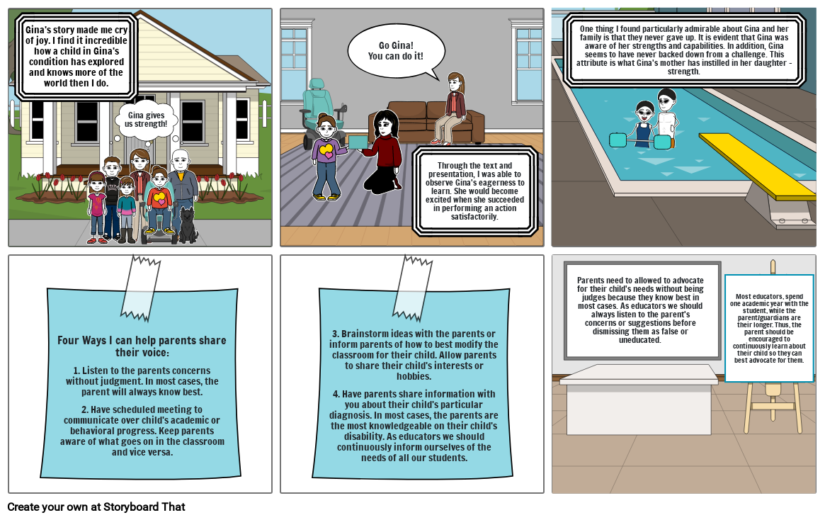 One thing I found particularly admirable about Gina and her family is that they never gave up. It is evident that Gina was aware of her strengths and capabilities. In addition, Gina seems to have never backed down from a challenge. This attribute is what Gina's mother has instilled in her daughter - strength.