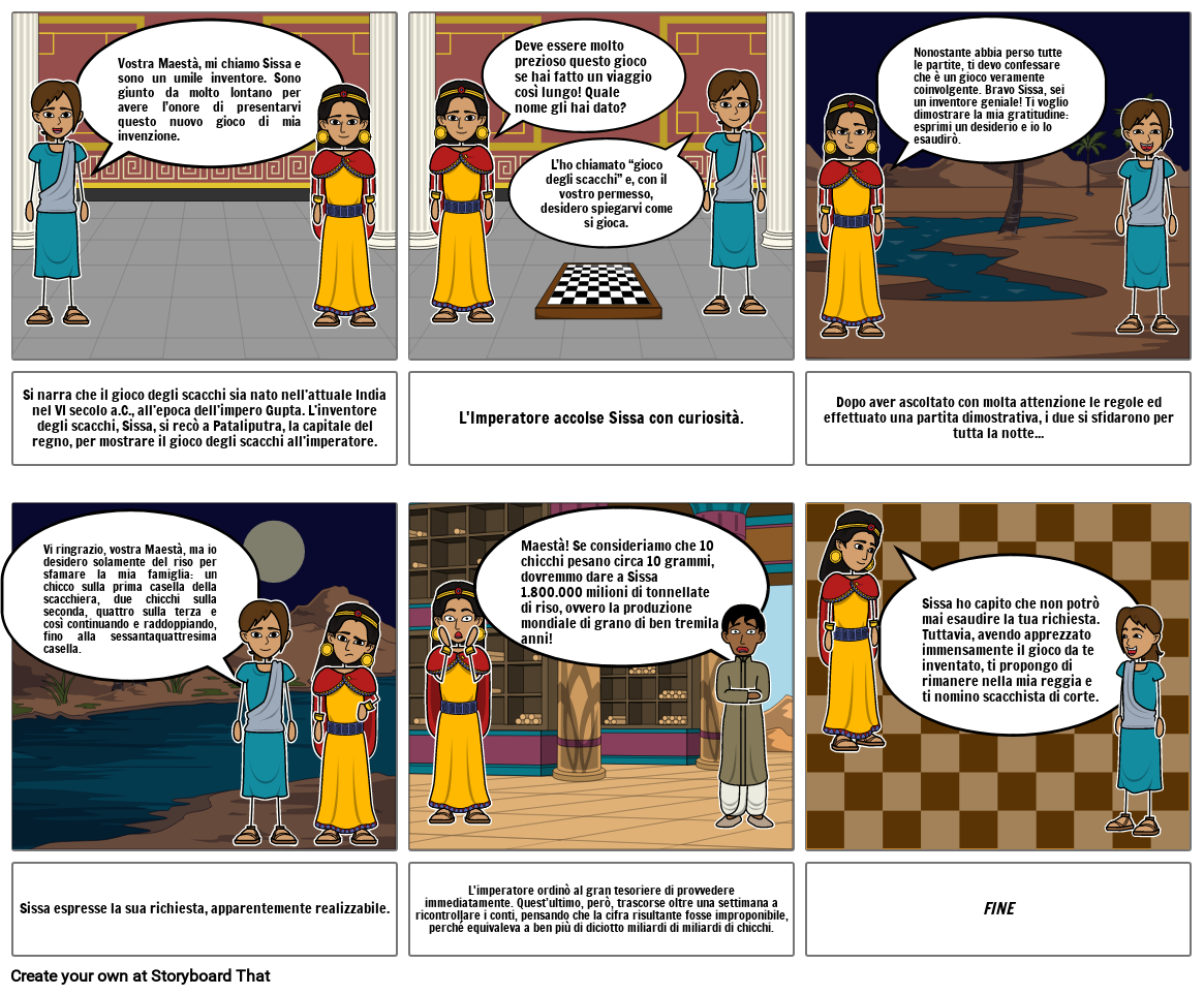 Vostra Maestà, mi chiamo Sissa e sono un umile inventore. Sono giunto da molto lontano per avere l’onore di presentarvi questo nuovo gioco di mia invenzione.