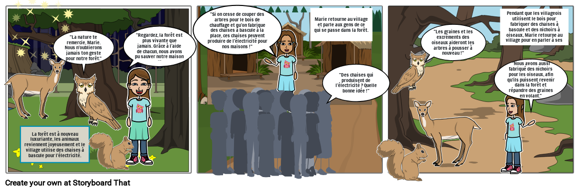 Pendant que les villageois utilisent le bois pour fabriquer des chaises à bascule et des nichoirs à oiseaux, Marie retourne au village pour en parler à ses amis.