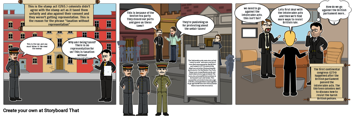 The intolerable acts were also called “coercive acts” and were a series of laws that were passed by the British parliament in 1774 to punish the American colonies (Massachusetts particularly) for the Boston Tea Party. These laws closed Boston ports and restricted colonial government. The laws also allowed British soldiers to be housed in private homes. This caused the colonists to become angry with this and made them come together to go against British rule which pushed them closer to the revolution.