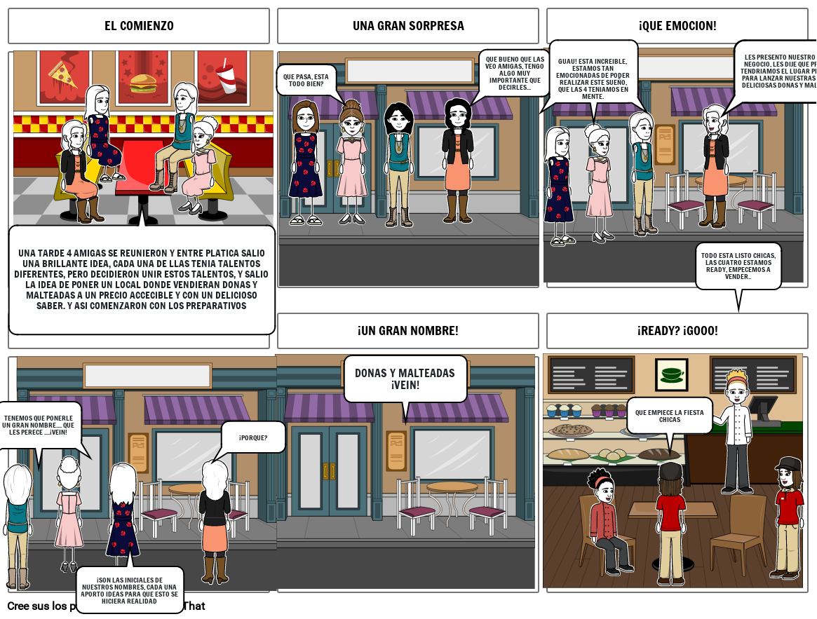 UNA TARDE 4 AMIGAS SE REUNIERON Y ENTRE PLATICA SALIO UNA BRILLANTE IDEA, CADA UNA DE LLAS TENIA TALENTOS DIFERENTES, PERO DECIDIERON UNIR ESTOS TALENTOS, Y SALIO LA IDEA DE PONER UN LOCAL DONDE VENDIERAN DONAS Y MALTEADAS A UN PRECIO ACCECIBLE Y CON UN DELICIOSO SABER. Y ASI COMENZARON CON LOS PREPARATIVOS
