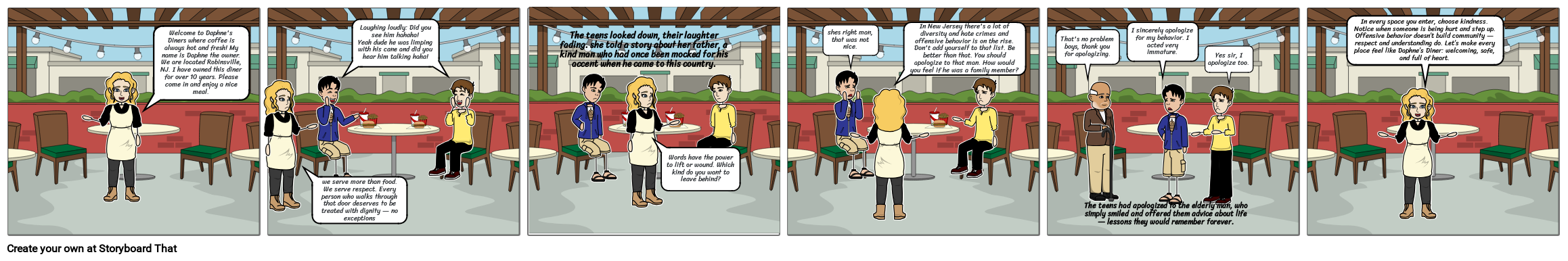 In every space you enter, choose kindness. Notice when someone is being hurt and step up. Offensive behavior doesn’t build community — respect and understanding do. Let’s make every place feel like Daphne’s Diner: welcoming, safe, and full of heart.