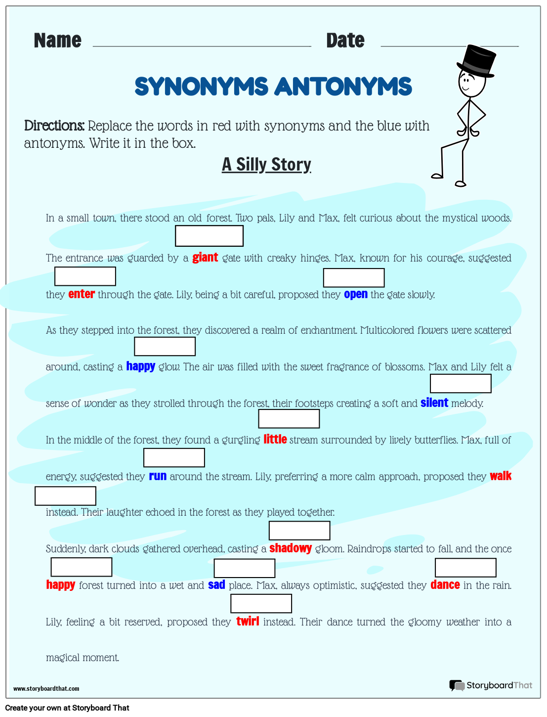 Directions: Replace the words in red with synonyms and the blue with antonyms. Write it in the box.