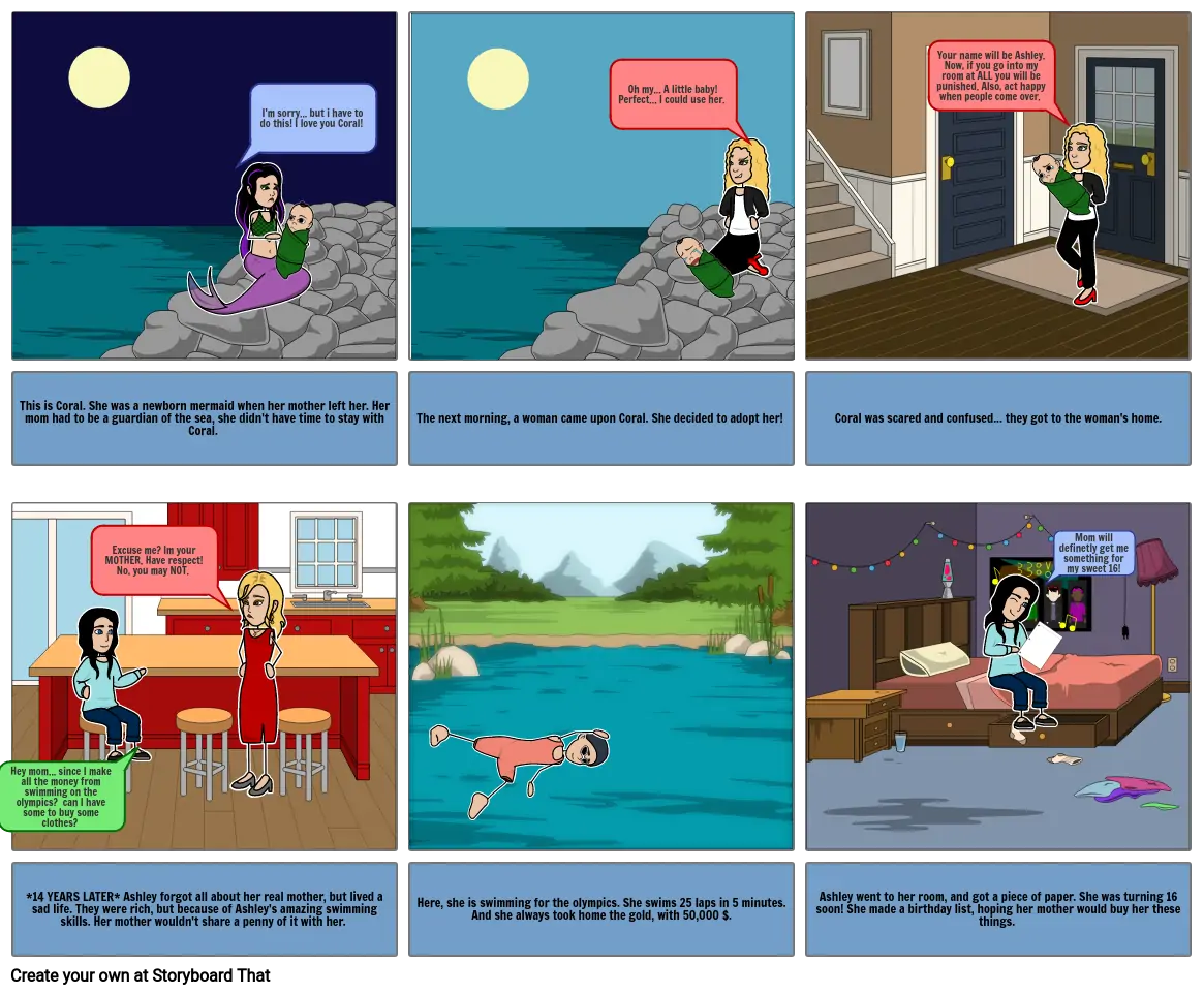 This is Coral. She was a newborn mermaid when her mother left her. Her mom had to be a guardian of the sea, she didn't have time to stay with Coral.