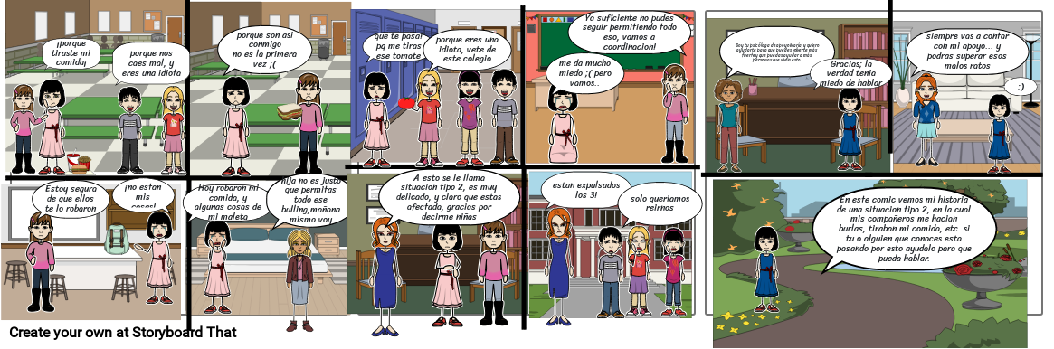 En este comic vemos mi historia de una situacion tipo 2, en la cual mis compañeros me hacian burlas, tiraban mi comida, etc. si tu o alguien que conoces esta pasando por esto ayudalo para que pueda hablar.