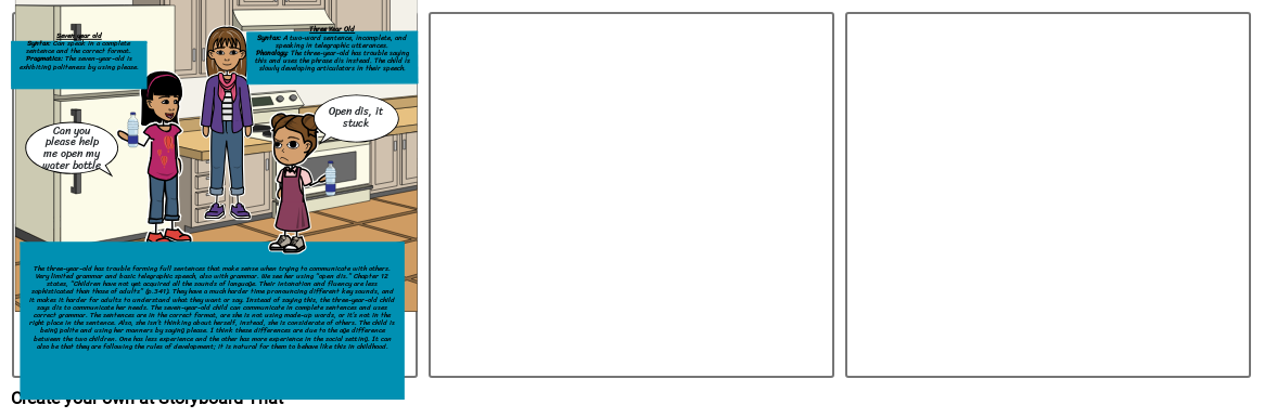 The three-year-old has trouble forming full sentences that make sense when trying to communicate with others. Very limited grammar and basic telegraphic speech, also with grammar. We see her using “open dis.” Chapter 12 states, “Children have not yet acquired all the sounds of language. Their intonation and fluency are less sophisticated than those of adults” (p.341). They have a much harder time pronouncing different key sounds, and it makes it harder for adults to understand what they want or say. Instead of saying this, the three-year-old child says dis to communicate her needs. The seven-year-old child can communicate in complete sentences and uses correct grammar. The sentences are in the correct format, are she is not using made-up words, or it’s not in the right place in the sentence. Also, she isn’t thinking about herself, instead, she is considerate of others. The child is being polite and using her manners by saying please. I think these differences are due to the age difference between the two children. One has less experience and the other has more experience in the social setting. It can also be that they are following the rules of development; it is natural for them to behave like this in childhood.