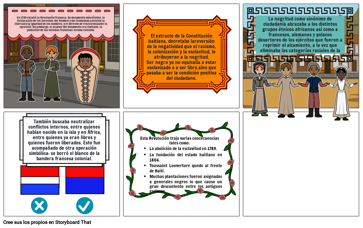 Esta Revolución trajo varias concecuencias tales como:La abolición de la esclavitud en 1789.La fundación del estado haitiano en 1804.Toussaint Louverture quedo al frente de Haití.Muchas plantaciones fueron asignadas a generales negros lo que causo un gran descontento entre los antiguos esclavos.