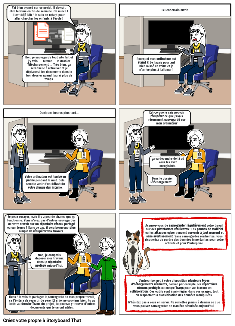 L'entreprise met à votre disposition plusieurs types d'hébergements résilients, comme par exemple, les répertoires réseaux protégés ou encore Teams pour vos travaux en collaboration. Ces outils sont à privilégier dans vos usages, tout en respectant la classification des données manipulées.N'hésitez pas à vous en servir. Ne remettez jamais à demain ce que vous pouvez sauvegarder de manière sécurisée aujourd'hui.