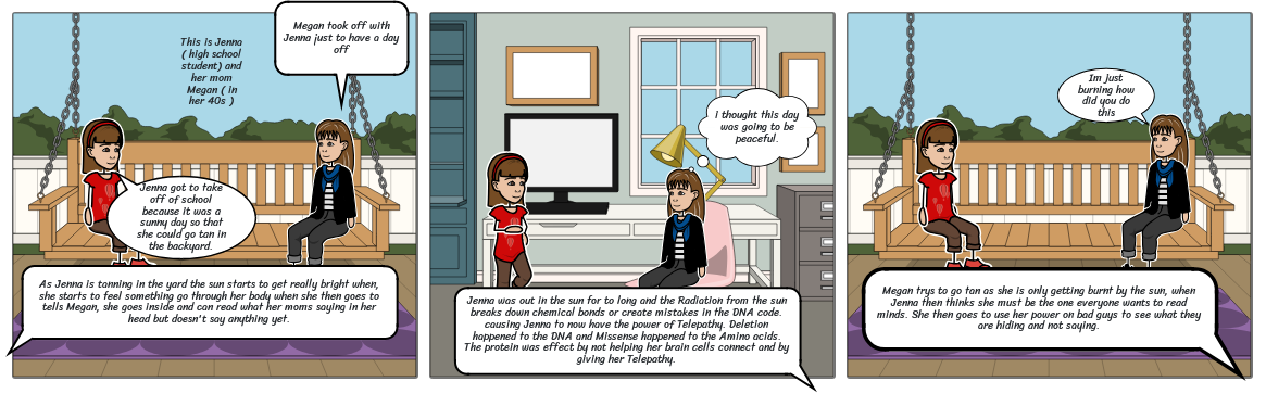 Jenna was out in the sun for to long and the Radiation from the sun breaks down chemical bonds or create mistakes in the DNA code. causing Jenna to now have the power of Telepathy. Deletion happened to the DNA and Missense happened to the Amino acids. The protein was effect by not helping her brain cells connect and by giving her Telepathy.