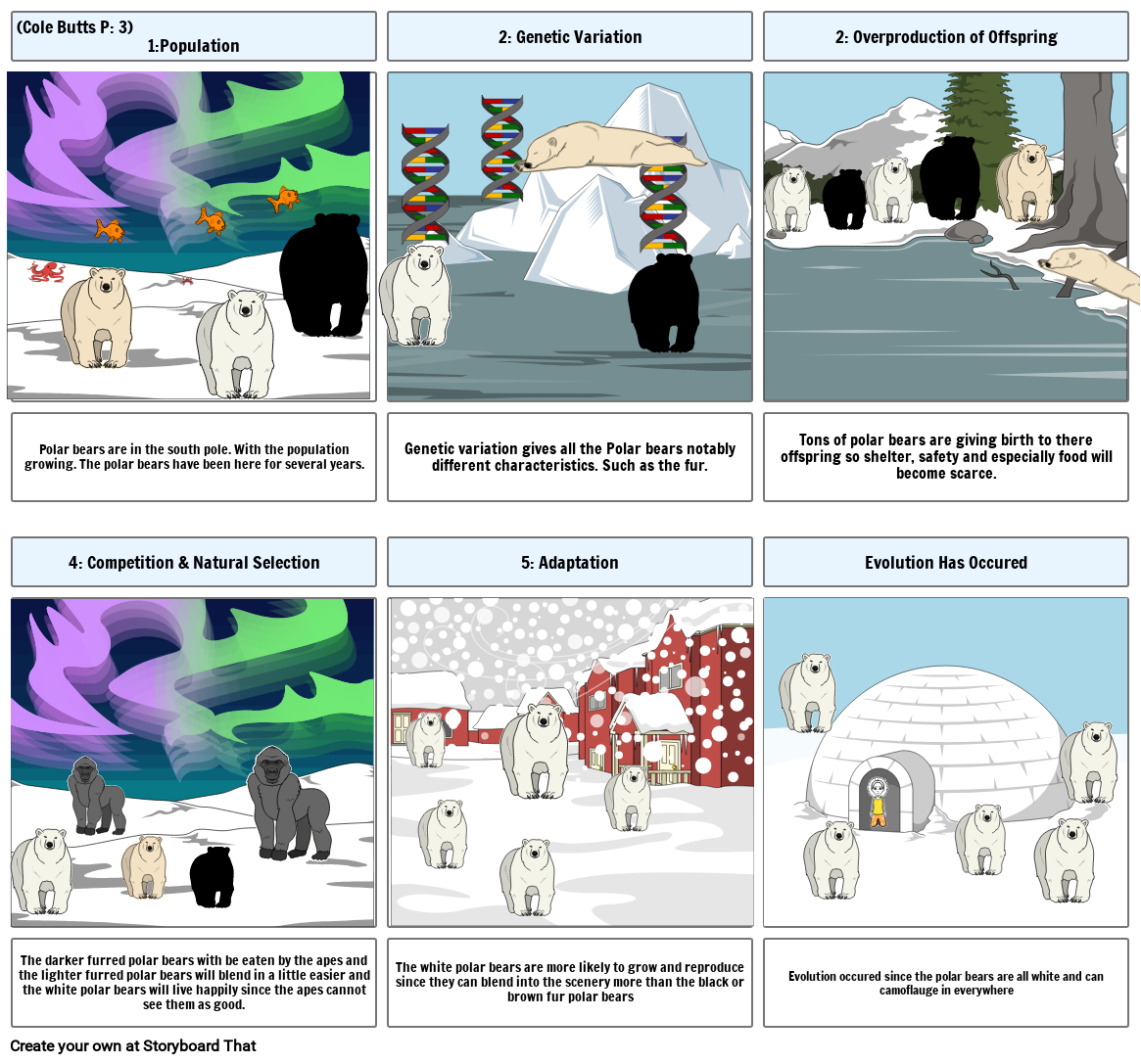 The white polar bears are more likely to grow and reproduce since they can blend into the scenery more than the black or brown fur polar bears