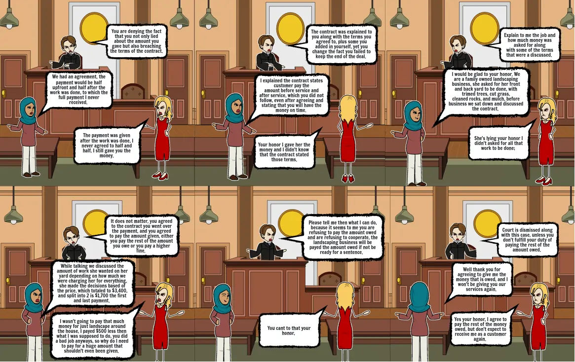 I would be glad to your honor. We are a family owned landscaping business, she asked for her front and back yard to be done, with trimed trees, cut grass, cleaned rocks, and mulch, before business we sat down and discussed the contract.