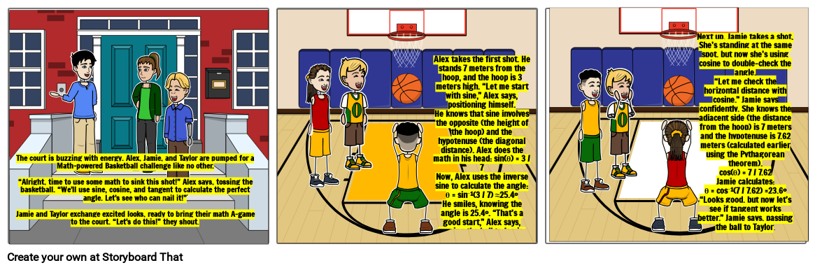 The court is buzzing with energy. Alex, Jamie, and Taylor are pumped for a Math-powered Basketball challenge like no other.“Alright, time to use some math to sink this shot!” Alex says, tossing the basketball. “We’ll use sine, cosine, and tangent to calculate the perfect angle. Let’s see who can nail it!”Jamie and Taylor exchange excited looks, ready to bring their math A-game to the court. “Let's do this!” they shout.