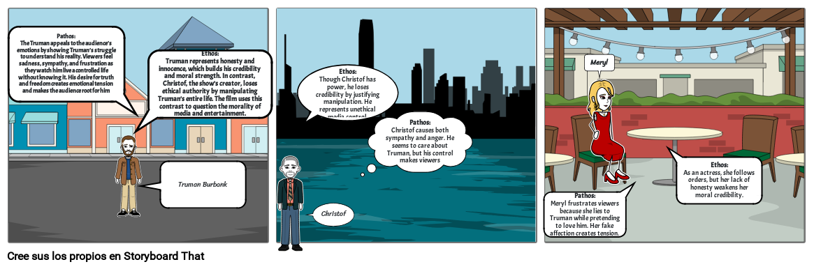 Ethos:Truman represents honesty and innocence, which builds his credibility and moral strength. In contrast, Christof, the show’s creator, loses ethical authority by manipulating Truman’s entire life. The film uses this contrast to question the morality of media and entertainment.