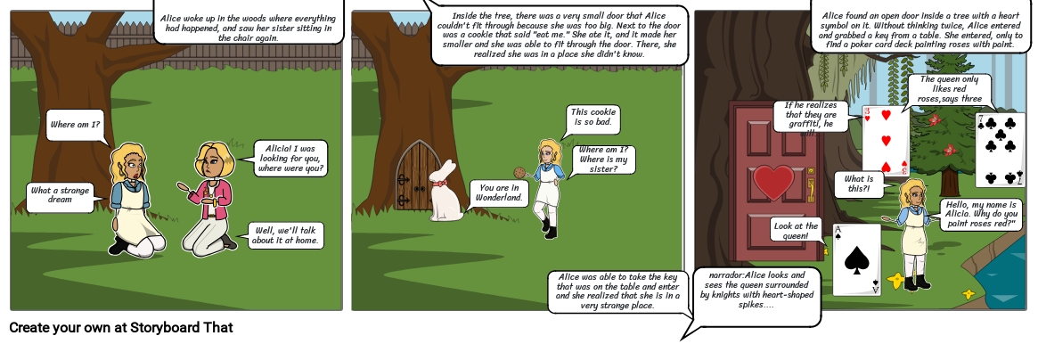 Inside the tree, there was a very small door that Alice couldn't fit through because she was too big. Next to the door was a cookie that said "eat me." She ate it, and it made her smaller and she was able to fit through the door. There, she realized she was in a place she didn't know.