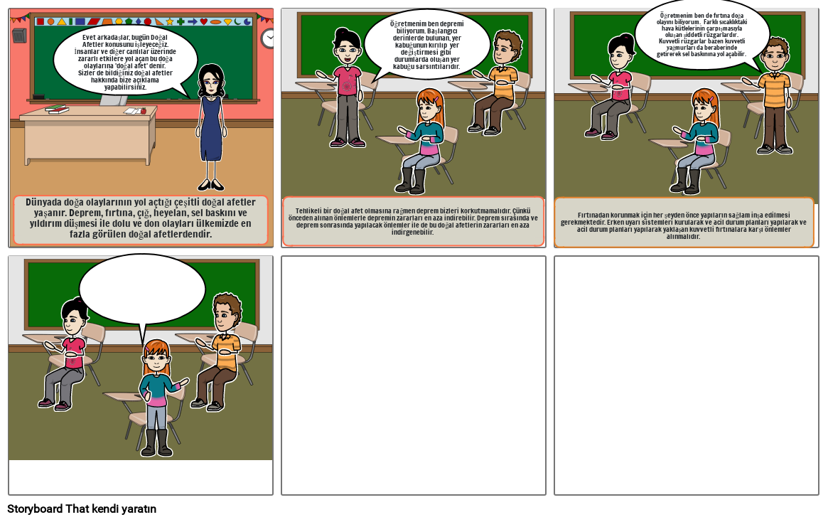 Evet arkadaşlar, bugün Doğal Afetler konusunu işleyeceğiz. İnsanlar ve diğer canlılar üzerinde zararlı etkilere yol açan bu doğa olaylarına 'doğal afet' denir. Sizler de bildiğiniz doğal afetler hakkında bize açıklama yapabilirsiniz.
