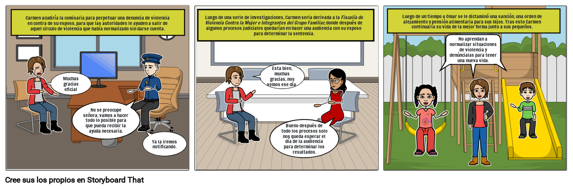 Luego de una serie de investigaciones, Carmen seria derivada a la Fiscalía de Violencia Contra la Mujer e Integrantes del Grupo Familiar, donde después de algunos procesos judiciales quedarían en hacer una audiencia con su esposo para determinar la sentencia.