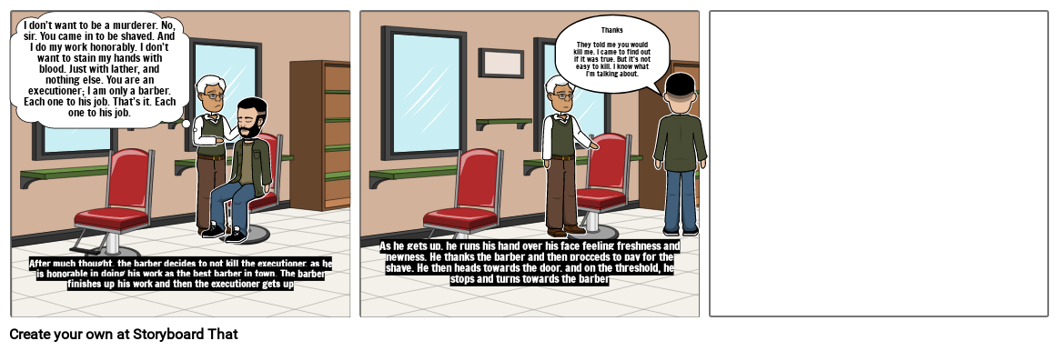 The executioner closes his eyes again and the barber resumes his work. The barber uses this as an opportunity to look outside as he is conflicted with contemplating the potential consequences of his actions.