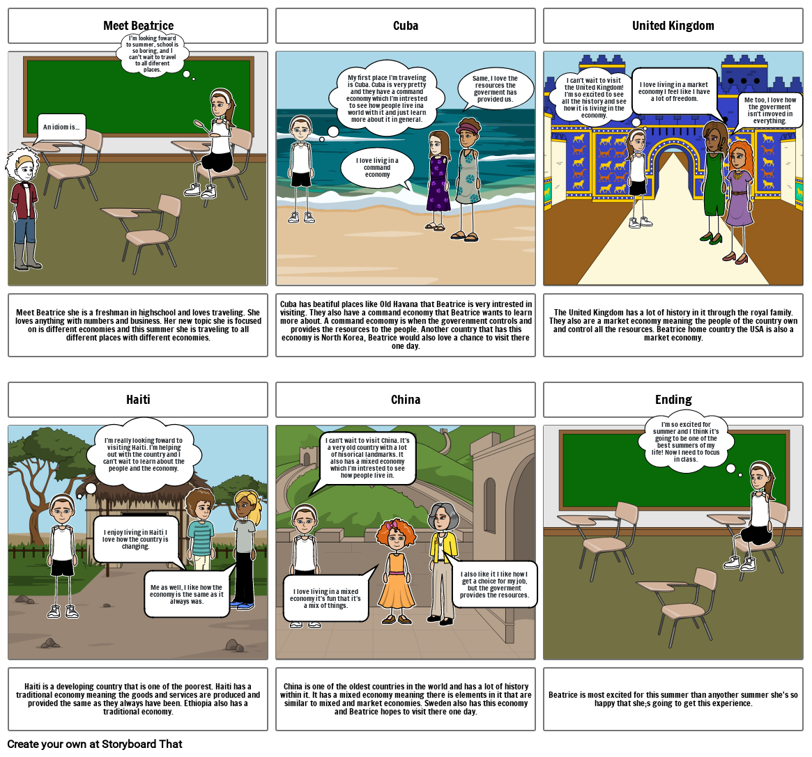 The United Kingdom has a lot of history in it through the royal family. They also are a market economy meaning the people of the country own and control all the resources. Beatrice home country the USA is also a market economy.