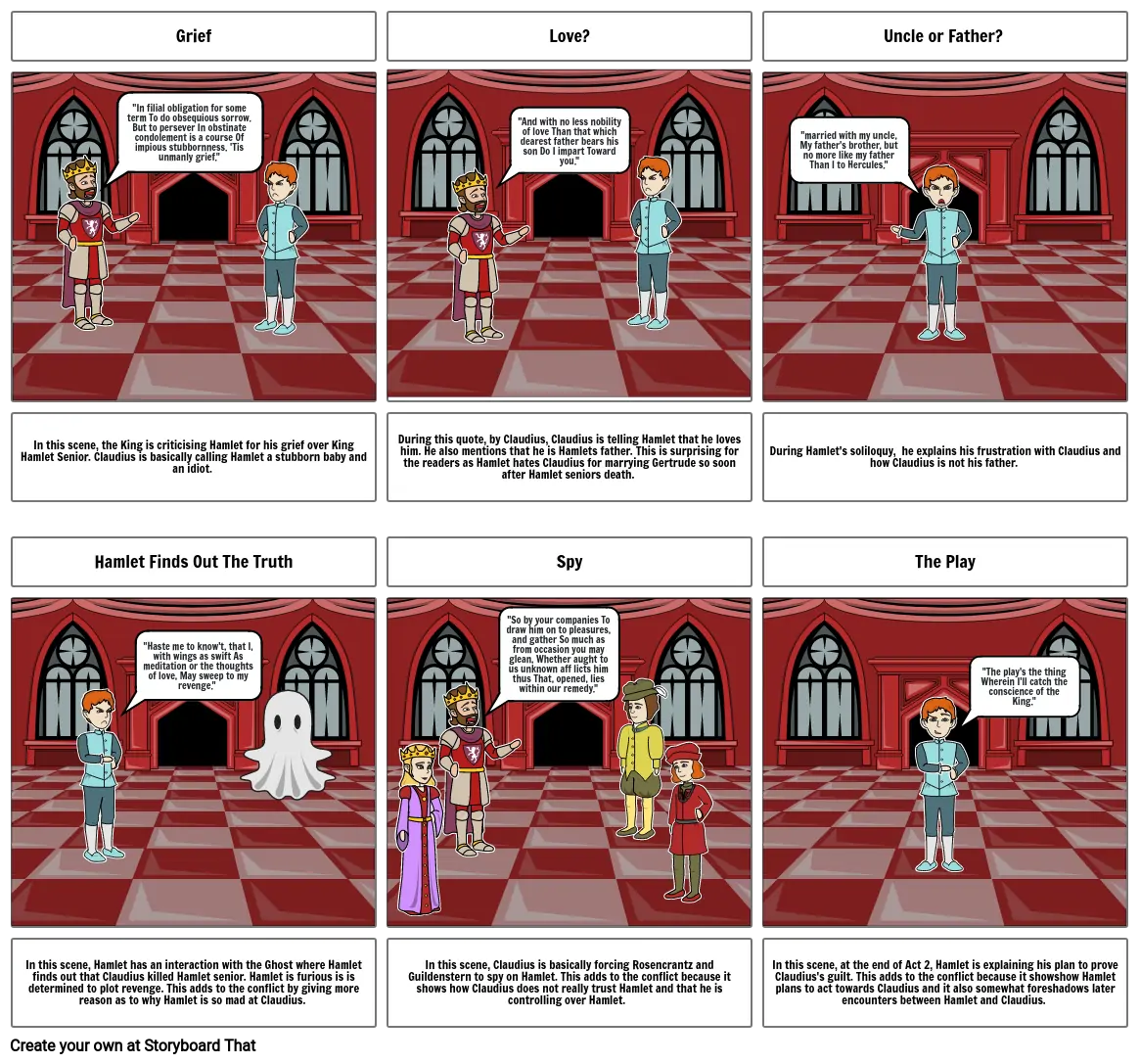 In this scene, at the end of Act 2, Hamlet is explaining his plan to prove Claudius's guilt. This adds to the conflict because it showshow Hamlet plans to act towards Claudius and it also somewhat foreshadows later encounters between Hamlet and Claudius.