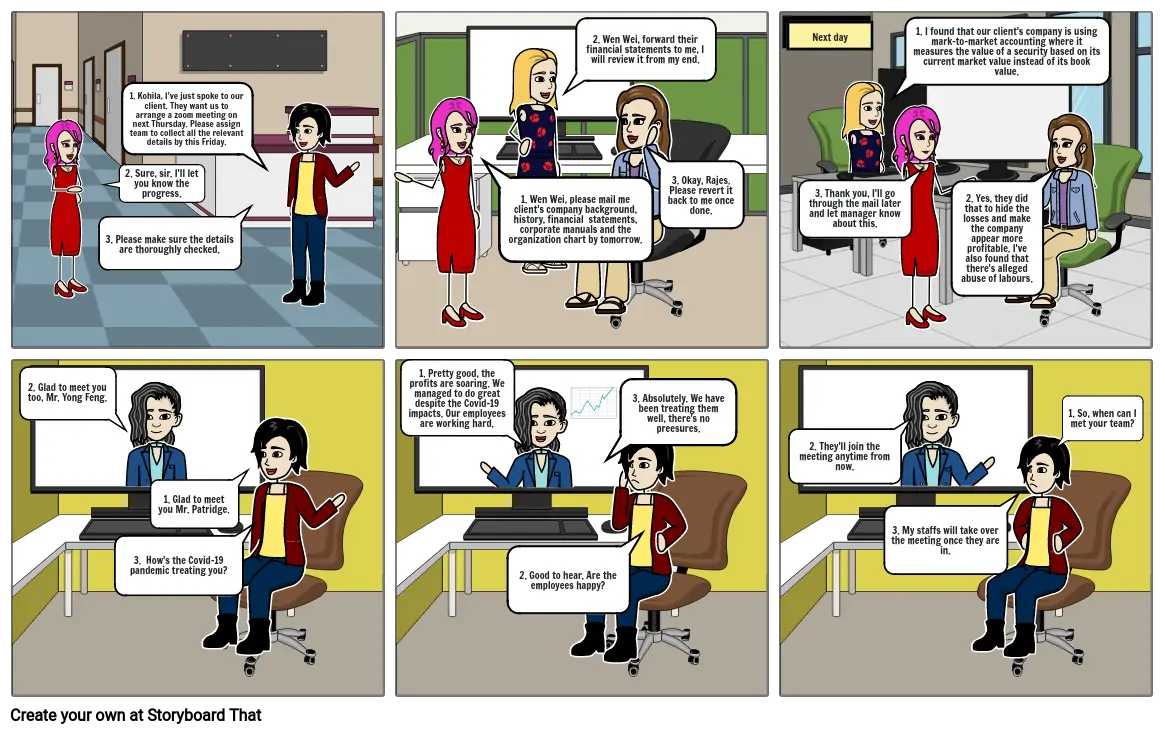 1. Wen Wei, please mail me client's company background, history, financial statements, corporate manuals and the organization chart by tomorrow.
