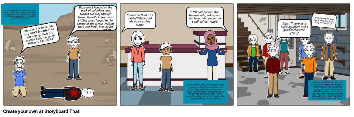 In this scene, Baba and Amir are down in a basement in attempt to reach freedom. There were 30 refugees all down there and one asked Baba why he won't pray with the rest of them. Moments later, Amir also realized Kamal and his father were with them.