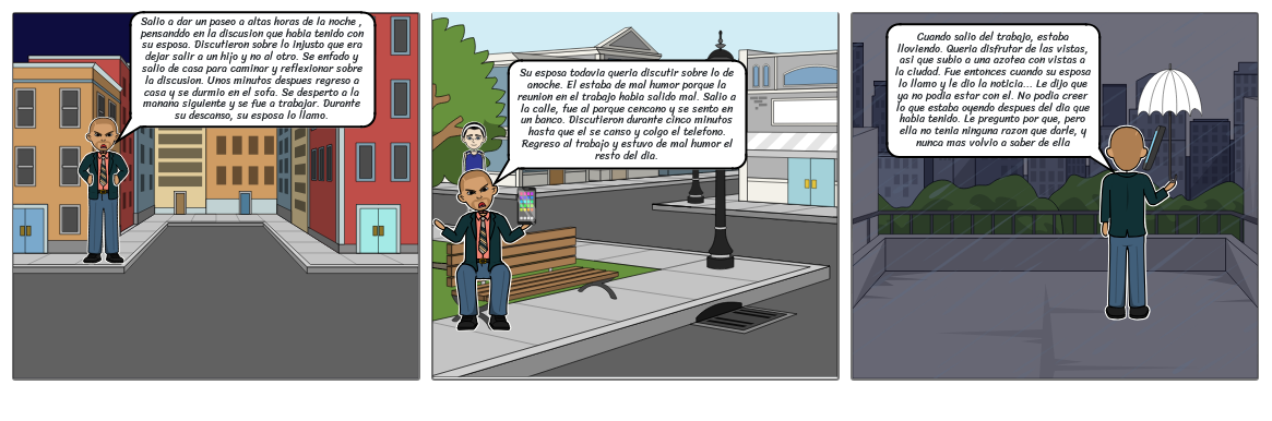 Su esposa todavia queria discutir sobre lo de anoche. El estaba de mal humor porque la reunion en el trabajo habia salido mal. Salio a la calle, fue al parque cencano y se sento en un banco. Discutieron durante cinco minutos hasta que el se canso y colgo el telefono. Regreso al trabajo y estuvo de mal humor el resto del dia.