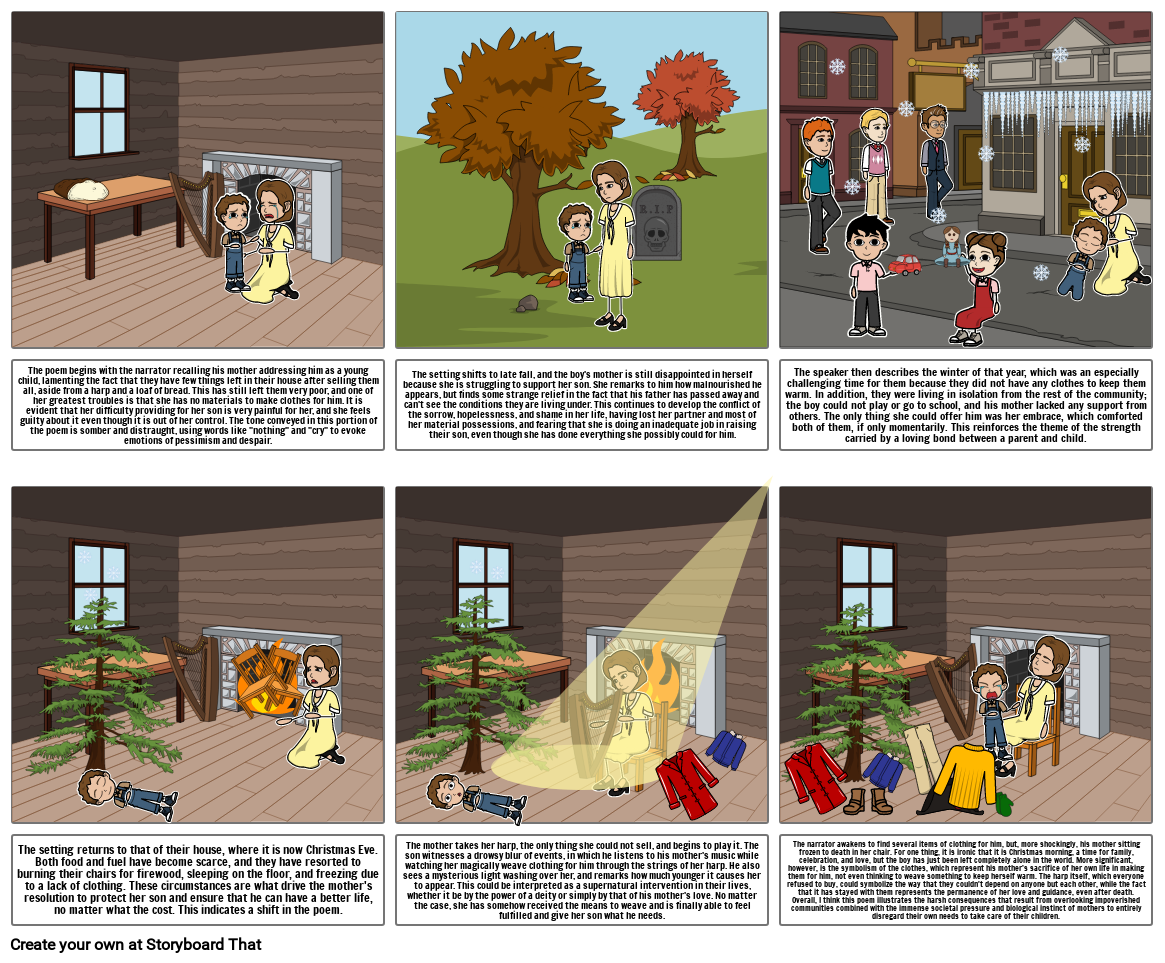 The narrator awakens to find several items of clothing for him, but, more shockingly, his mother sitting frozen to death in her chair. For one thing, it is ironic that it is Christmas morning, a time for family, celebration, and love, but the boy has just been left completely alone in the world. More significant, however, is the symbolism of the clothes, which represent his mother’s sacrifice of her own life in making them for him, not even thinking to weave something to keep herself warm. The harp itself, which everyone refused to buy, could symbolize the way that they couldn't depend on anyone but each other, while the fact that it has stayed with them represents the permanence of her love and guidance, even after death. Overall, I think this poem illustrates the harsh consequences that result from overlooking impoverished communities combined with the immense societal pressure and biological instinct of mothers to entirely disregard their own needs to take care of their children.