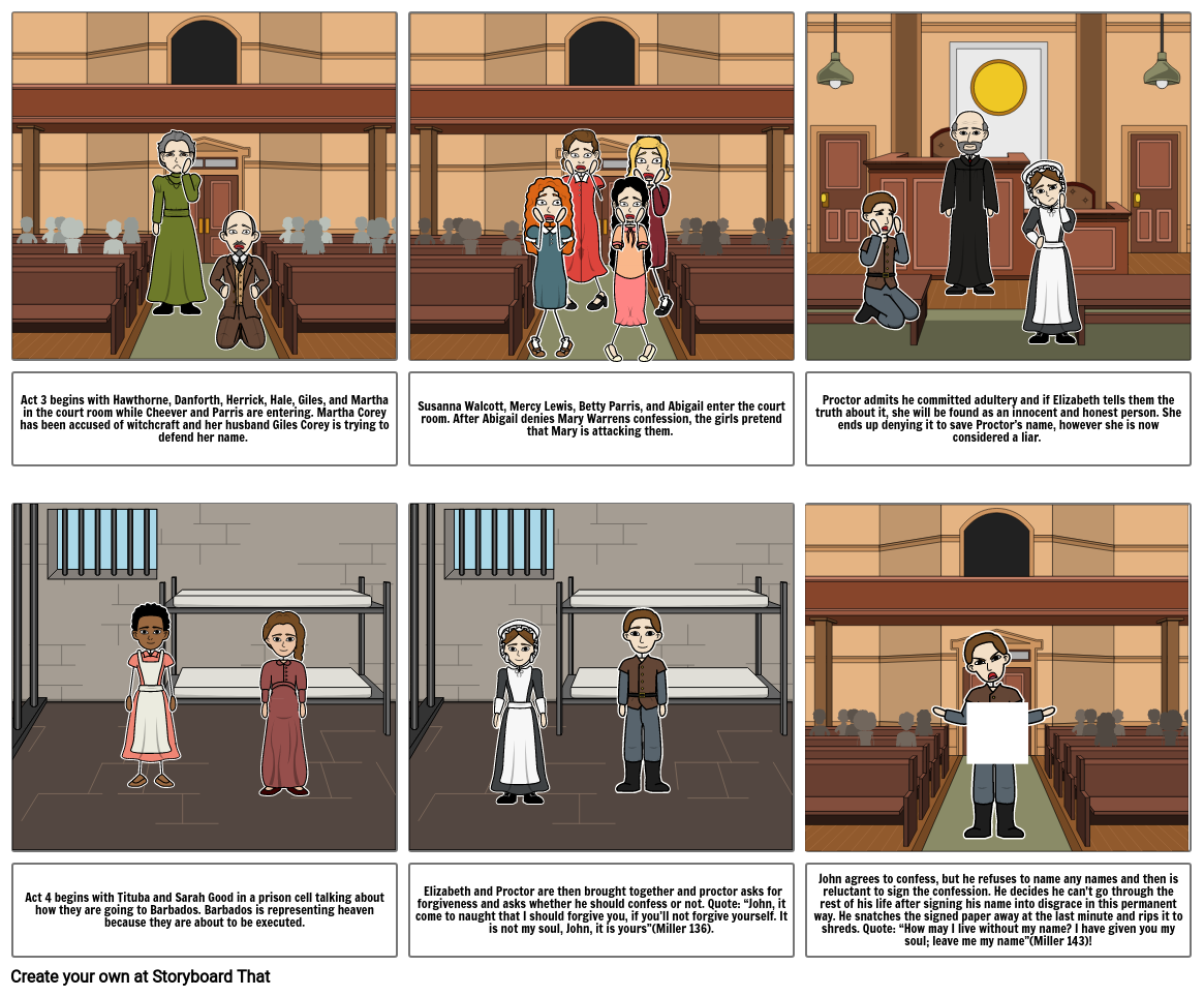 Act 3 begins with Hawthorne, Danforth, Herrick, Hale, Giles, and Martha in the court room while Cheever and Parris are entering. Martha Corey has been accused of witchcraft and her husband Giles Corey is trying to defend her name.