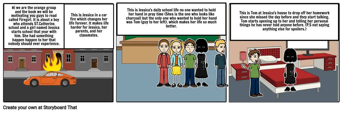 Hi we are the orange group and the book we will be motivating you guys to read called Firegirl. It is about a boy who attends ST.Catherins school and a girl named Jessica starts school that year with him. She had something happen happen to her that nobody should ever experience.