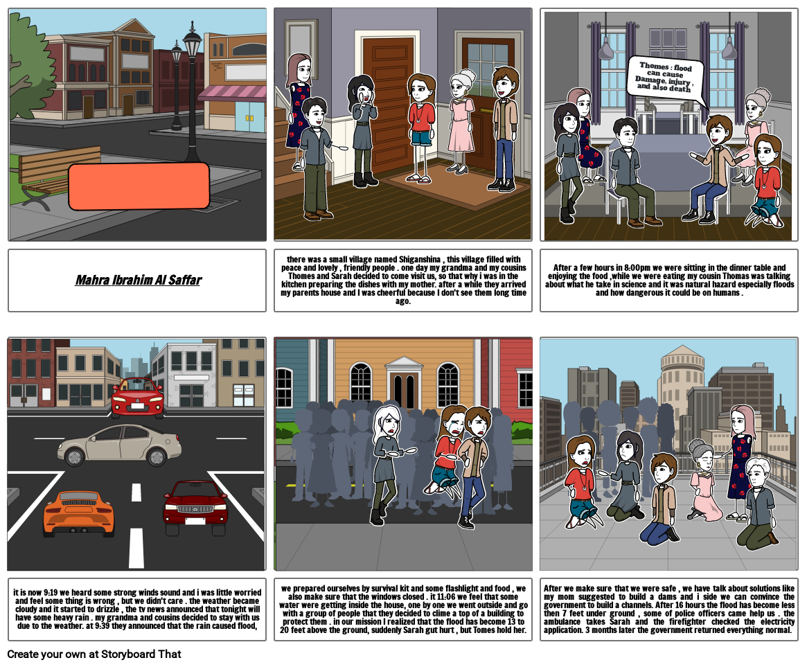 we prepared ourselves by survival kit and some flashlight and food , we also make sure that the windows closed . it 11:06 we feel that some water were getting inside the house, one by one we went outside and go with a group of people that they decided to clime a top of a building to protect them . in our mission I realized that the flood has become 13 to 20 feet above the ground, suddenly Sarah gut hurt , but Tomes hold her.