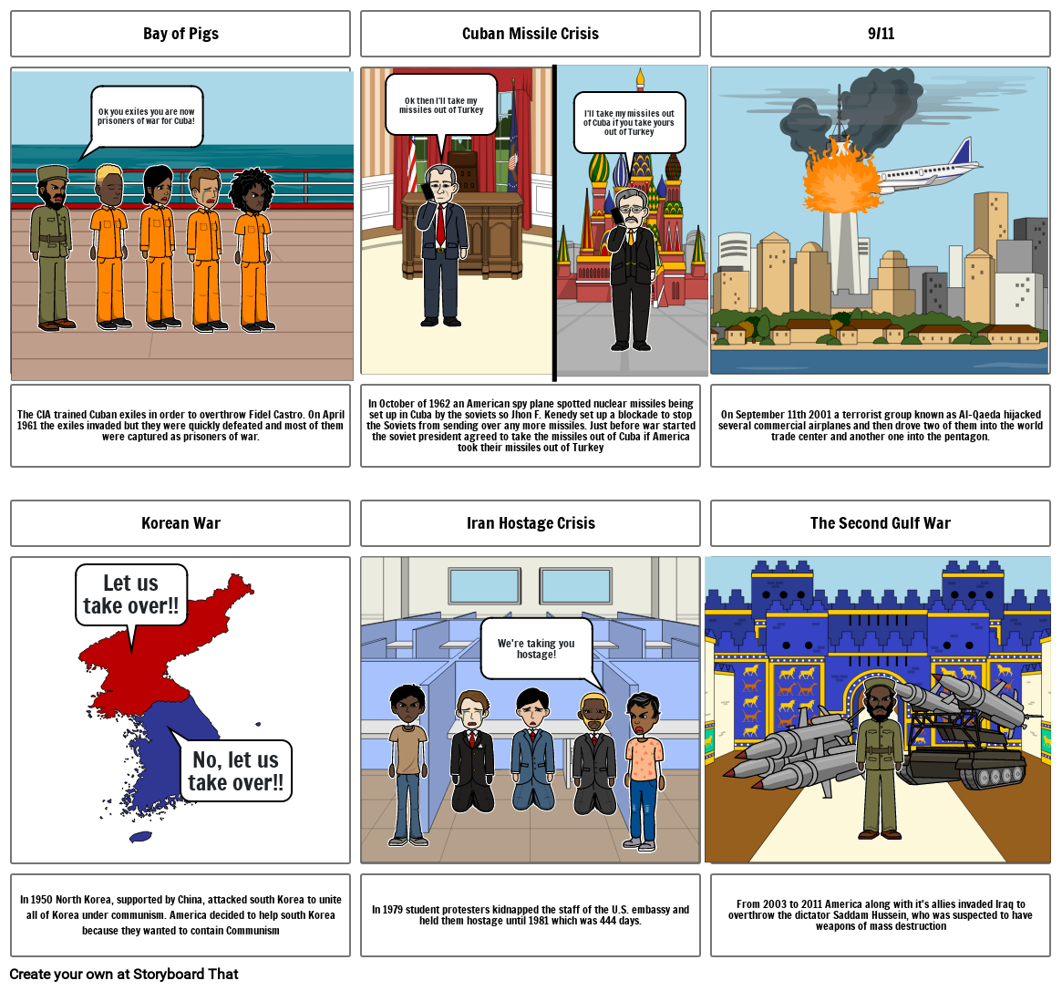 In October of 1962 an American spy plane spotted nuclear missiles being set up in Cuba by the soviets so Jhon F. Kenedy set up a blockade to stop the Soviets from sending over any more missiles. Just before war started the soviet president agreed to take the missiles out of Cuba if America took their missiles out of Turkey