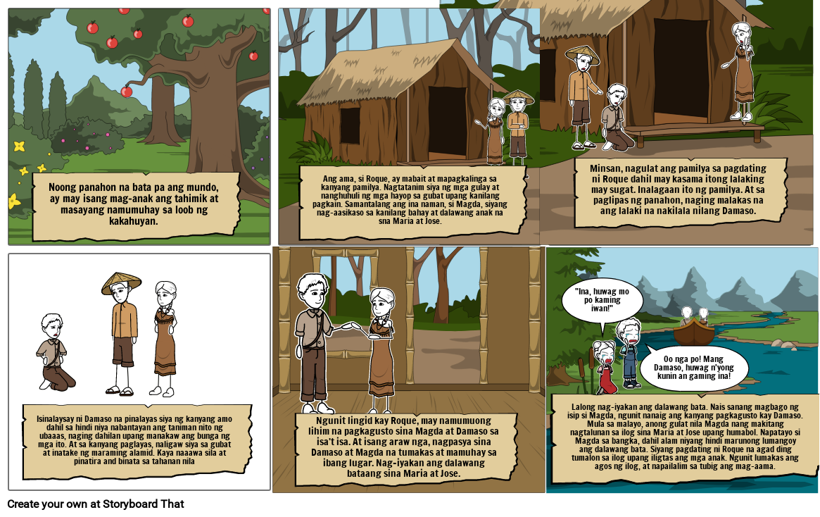 Ang ama, si Roque, ay mabait at mapagkalinga sa kanyang pamilya. Nagtatanim siya ng mga gulay at nanghuhuli ng mga hayop sa gubat upang kanilang pagkain. Samantalang ang ina naman, si Magda, siyang nag-aasikaso sa kanilang bahay at dalawang anak na sna Maria at Jose.
