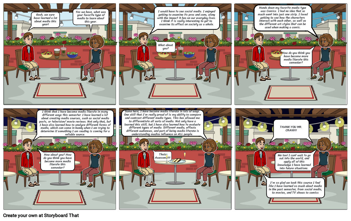 I'm so glad we took this course I feel like I have learned so much about media in the past semester, from social media, to movies, and TV shows to comics
