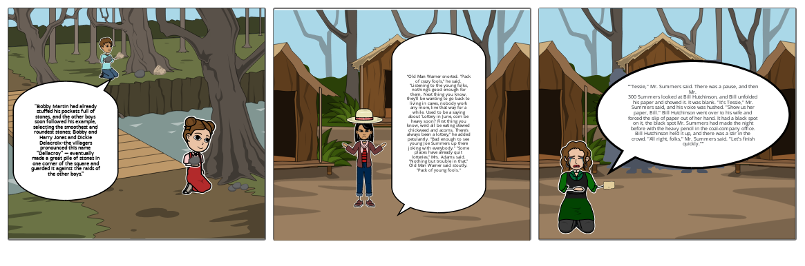“"Tessie," Mr. Summers said. There was a pause, and then Mr.300 Summers looked at Bill Hutchinson, and Bill unfolded his paper and showed it. It was blank. "It's Tessie," Mr. Summers said, and his voice was hushed. "Show us her paper, Bill." Bill Hutchinson went over to his wife and forced the slip of paper out of her hand. It had a black spot on it, the black spot Mr. Summers had made the night before with the heavy pencil in the coal-company office. Bill Hutchinson held it up, and there was a stir in the crowd. "All right, folks," Mr. Summers said. "Let's finish quickly."”