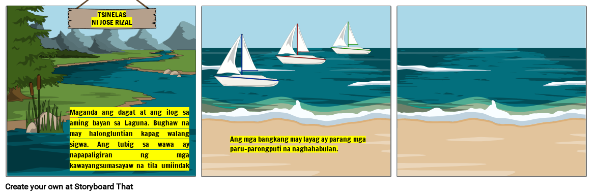 Maganda ang dagat at ang ilog sa aming bayan sa Laguna. Bughaw na may halongluntian kapag walang sigwa. Ang tubig sa wawa ay napapaligiran ng mga kawayangsumasayaw na tila umiindak kapag nahihipan ng hangin.