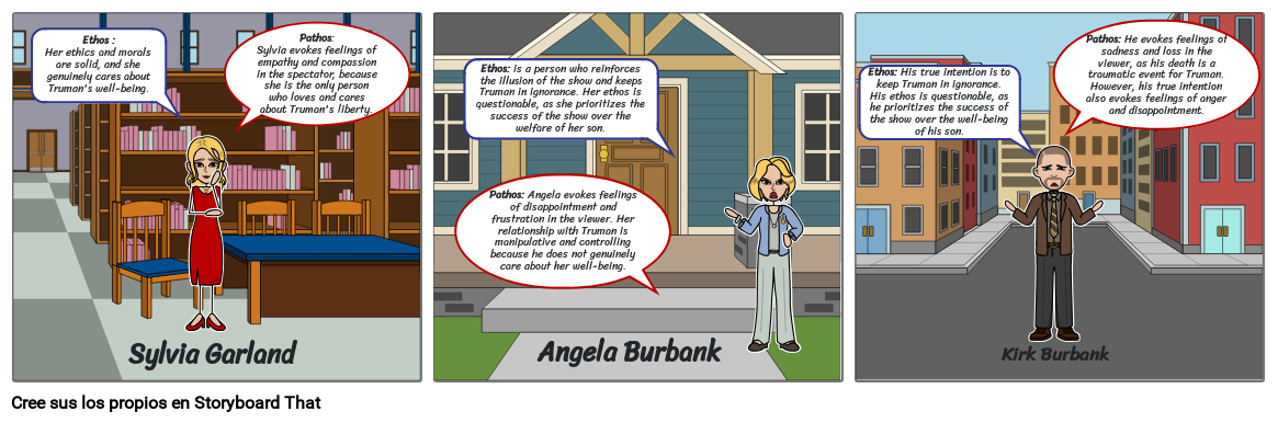 Ethos: is a person who reinforces the illusion of the show and keeps Truman in ignorance. Her ethos is questionable, as she prioritizes the success of the show over the welfare of her son.