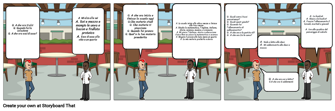 A. Mi alzo alle seiA. Sei e mezzo e mangio le uova e bacon e frullato proteicoA. Esco di casa alle otto e un quarto