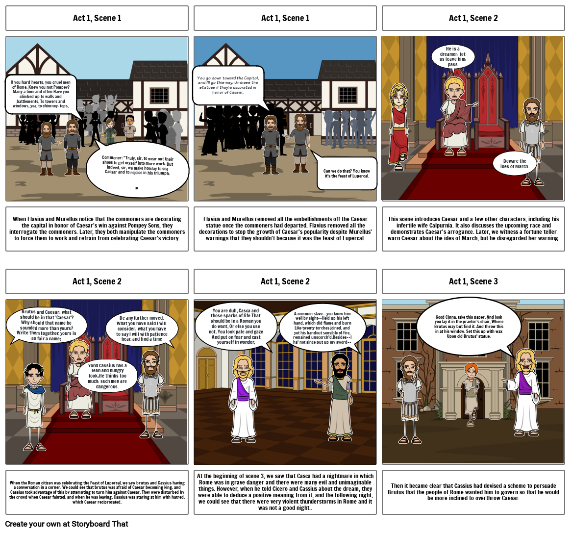 When the Roman citizen was celebrating the Feast of Lupercal, we saw brutus and Cassius having a conversation in a corner. We could see that brutus was afraid of Caesar becoming king, and Cassius took advantage of this by attempting to turn him against Caesar. They were disturbed by the crowd when Caesar fainted, and when he was leaving, Cassius was staring at him with hatred, which Caesar reciprocated.