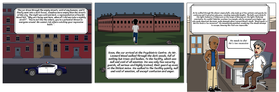 As he walked through the almost empty halls, only made up of few patients and guards, his confusion and frustration only grew, reaching impossible heights. The halls were dimly lit, the lights looked as if they were on the verge of blowing out, the lights flickering constantly. He couldn’t help but overhear two people, who he assumed were higher-ups who made important decisions, make demands about Leonard Mead’s death. “Mead needs to die! His brain is too recessive!”. He immediately panicked, wondering if he should attempt to escape, knowing this task was impossible.
